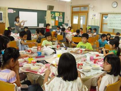 ランチルームでは3年生が3色の食べ物の働きの話を聞きました。7月2日の献立は「焼き肉」・「中華コーンスープ」でした。給食の食材全部を赤・黄・緑に分けてみました。給食が始まるとおかわりに行列ができ,大好評でした。