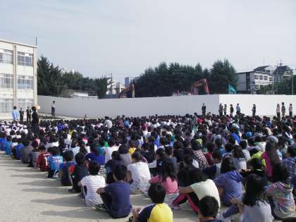 体育館もすっかり姿が見えなくなり,運動場に全校で集まることにも慣れてきました。