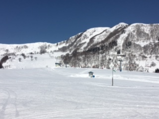 スキー実習1が始まりました。天気は快晴。雪質も最高です。インストラクターさんとの対面式を終え体操をして始めます。