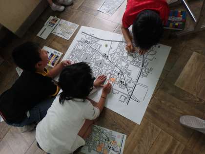 校区探検で調べたことを白地図に整理しています。地図記号を使ったり,班で決めた色でぬったりして,より分かりやすい地図を目指しています。