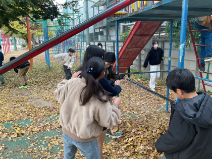 図工の時間に校庭に出て、落ち葉や枝を使って色合いや場所の特徴をいかして作品作りに取り組みました。友達と相談しながら、落ち葉や枝を組み合わせて夢中になって活動に取り組む子ども達の姿が見られました。