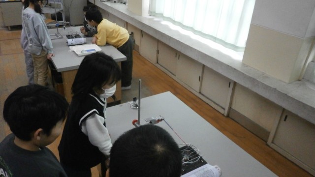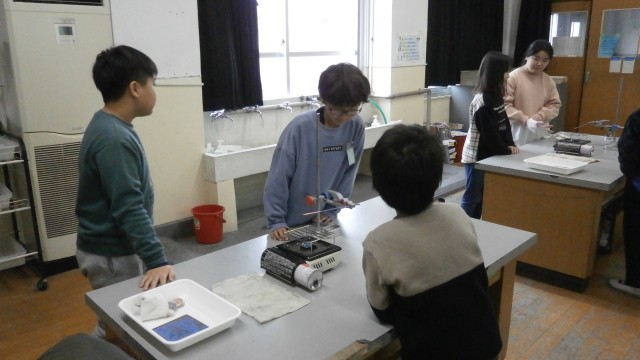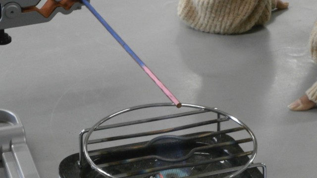 理科の学習では、ガスコンロを使って、金属の温まり方について実験をしました。