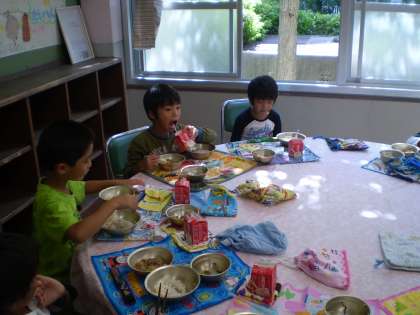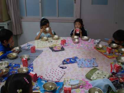 1年2組は,初めてのランチルーム。みんなこの日をとても楽しみに待っていました。いつもとちがう雰囲気で楽しく給食を食べることができました。