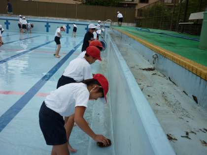 雨で一度延期になったプール清掃。この日は,子どもたちの意欲的に活動する様子が見られました。学校や全校児童のために,必死にたわしやデッキブラシで磨いていました。今週からいよいよ水泳学習が始まります。去年までとは違い,自分たちが掃除したプールで学習します。達成感を味わいながら,楽しく泳いでほしいと思います。