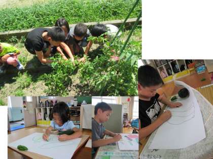 今日は収穫をして,他の夏野菜と一緒に絵に表しました。ピーマンの凹凸や色の違いに気をつけながら制作していました。