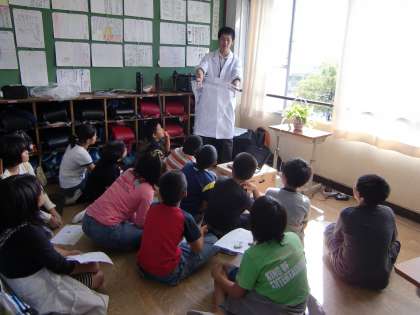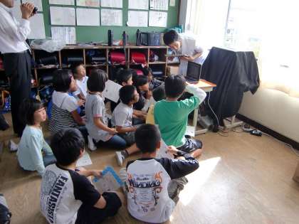 日光を当ててビニール袋をかぶせるとどうなるか,日光を当てずにビニール袋をかぶせるとどうなるか,予想しました。結果は,日光を当てると光合成をし,日光が当たらなければ植物は光合成はせず「呼吸」をします。「だから夜,植物は呼吸しているんだよ。」という研究所のお兄さんの言葉に子ども達はとても驚いていました。