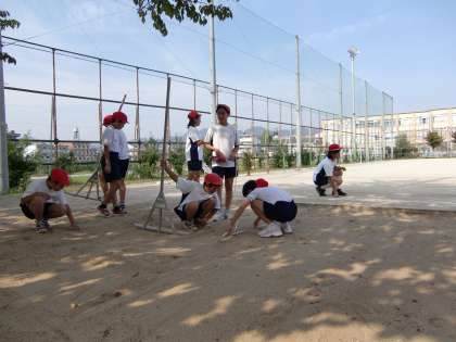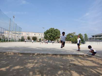 体育では走りはばとびの学習が始まりました。グループを2つに分けて,その中で前半・後半で競技をするグループと測定やとんぼ係の準備グループに分かれて活動しました。