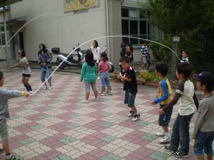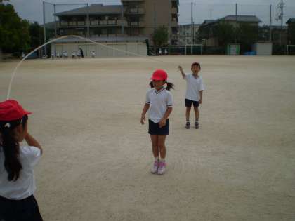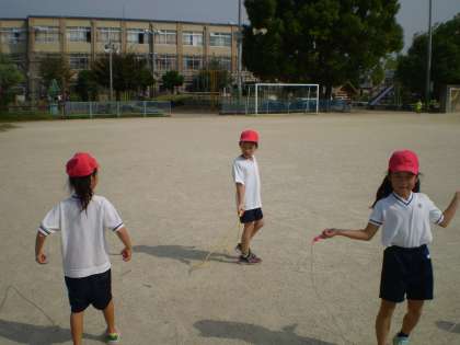 体育の時間になわとびの練習を頑張っています。両足跳び,けんけん跳びなど練習するたびに上手に跳べるようになってきました。大縄跳びも頑張っています。「もっと上手になりたい。」と言って,休み時間に進んで練習している子もたくさんいます。