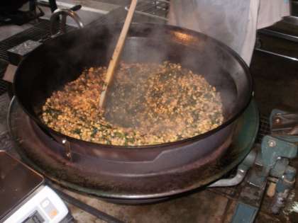 「肉みそいため」は豚肉・こんにゃく・大豆・ほうれん草・しいたけの具材を炒めて、味つけしました。甘辛い味つけでごはんがとても進みました。