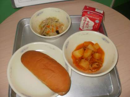 味つけコッペパン・牛乳・豚肉のケチャップ煮・たっぷり野菜のビーフン