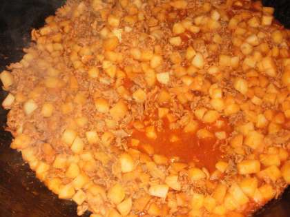 「豚肉のケチャップ煮」は豚肉を炒めてケチャップとウスターソースで味つけをして、蒸したたくさんのじゃがいもを加えて仕上げました。