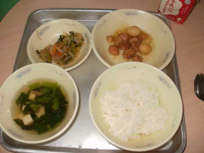 ごはん・牛乳・鶏肉のさっぱり煮・小松菜と切干大根の煮びたし・すまし汁