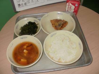 ごはん・牛乳・さばのたつたあげ・ほうれん草のおかか煮・みそ汁