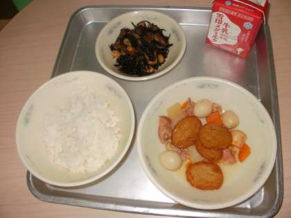 ごはん・牛乳・平天とこんにゃくの煮つけ・ひじき豆