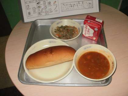 黒糖コッペパン・牛乳・トマトシチュー・ごぼうのソテー