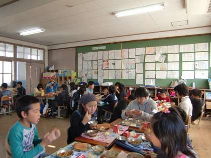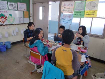 先週と今週,学生ボランティアの澤田先生と田原先生が5年生に来てくださり,一緒に給食を食べました。