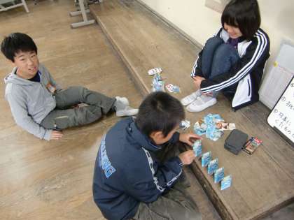 子どもたちはトランプゲームをしています。ほかに,トランプでピラミッド