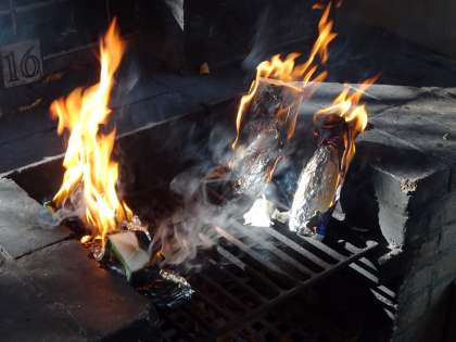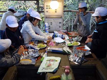 山の家での最後の朝食はパックドックです。具材をはさんだバンをアルミホイルで包んで牛乳パックに入れます。牛乳パックに火をつけて…牛乳パックが燃えつけたら出来上り。少し焦げてても自分で作ったものは,格別です。