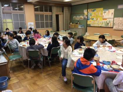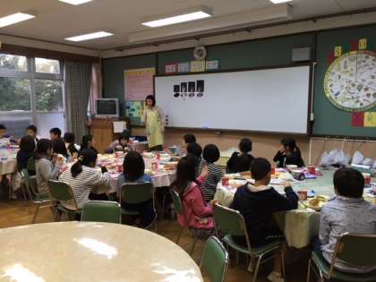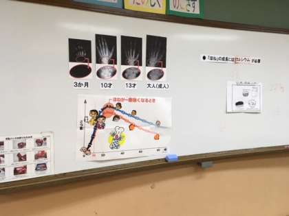 今日はランチルームで栄養教諭の出野先生から骨をつくるカルシウムの働きについて教えてもらいました。