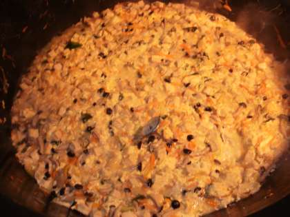 「高野どうふの卵とじ」は「高野どうふ」を味つけしただし汁で煮ます。人参・玉ねぎを別の釜で柔らかくなるまで煮て、しめじ・高野どうふ・青ねぎを入れて最後に割ほぐした卵を溶きいれ、ふたをして弱火で蒸すように加熱し、卵の3分の2に火が通れば火を強めて混ぜ仕上げました。ふわふわでとろとろで美味しかったです。