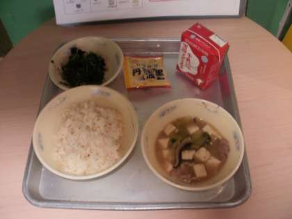 麦ごはん・牛乳・豚肉ととうふのくず煮・ほうれん草とじゃこのいためもの・黒大豆