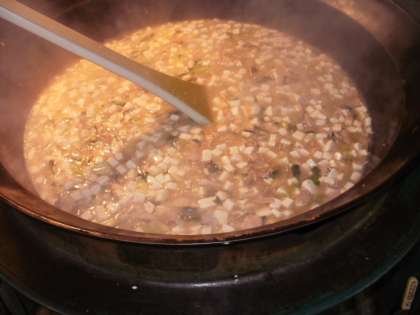 「豚肉ととうふのくず煮」はだし汁に豚肉・玉ねぎ・しいたけを柔らかく煮て、たくさんのとうふを入れて調味し、チンゲン菜・しょうが最後に片栗粉でとじて仕上げました。だしがよくきいて熱々で美味しかったです。