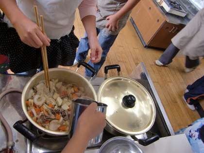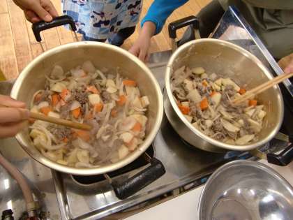 おいしくなるようにみんなで協力してかきまぜます。