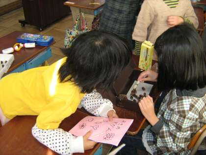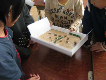 落ち葉やどんぐりなどを利用して,かざりやおもちゃを作りました。かざりを観賞し合った後,みんなでおもちゃを使って遊びました。