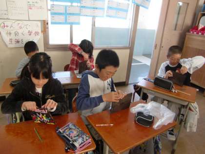 山の家で作った焼き杉板に,ヒートンを付けてひもを通しました。