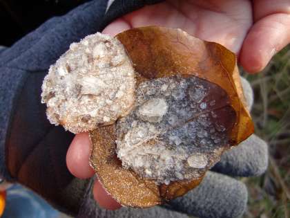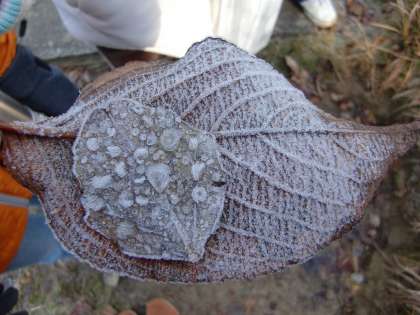 花背の朝は氷点下まで下がる時もあるとのことで,葉っぱがくっついて凍っているのを発見!!