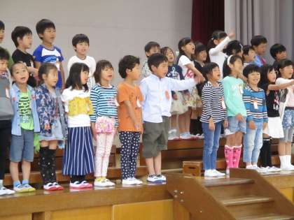 今日の3時間目に2年生から6年生までの,お兄さん・お姉さん達に「お迎え集会」を開いてもらいました。入場の時には,6年生のお兄さん・お姉さんが手をつないでくれました。どの学年の出し物も,1年生のことを思った出し物で,教室に戻ってきた1年生の子どもたちは「楽しかったぁ!もう一回してほしい!」と言っていました。お兄さん・お姉さん達の出し物のお礼に,「どきどきどん!一年生」の歌を歌いました。