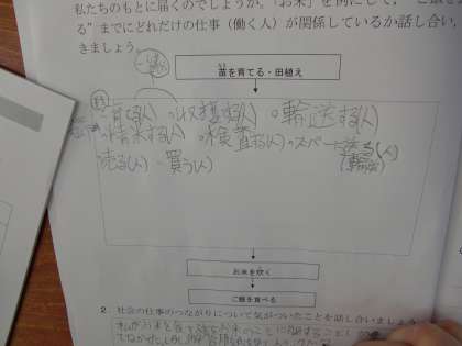 たとえば「お米」では田植え→お米を食べるまでにどれぐらいの過程があるのかをグループで考えました。