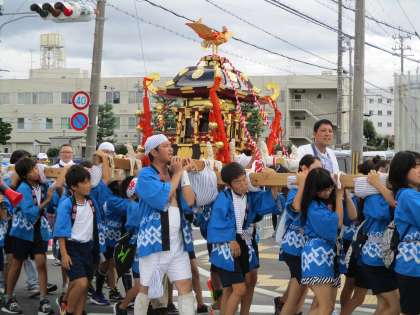 たくさんの子どもたちが元気におみこしを担いで学区内を巡行しました。