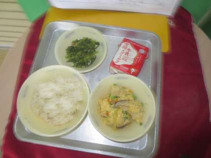 麦ごはん・牛乳・高野どうふの卵とじ・だいこん葉のごまいため