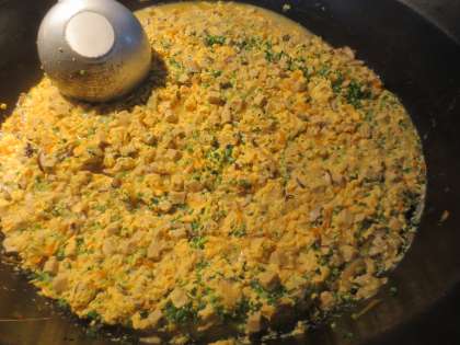 「高野どうふの卵とじ」は味つけをしただし汁で高野どうふと野菜をそれぞれ煮て味を含ませ,溶き卵と細ねぎを加えて煮て仕上げました。高野どうふに味が染み込み美味しく頂けました。