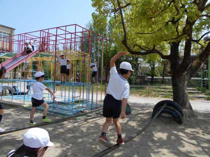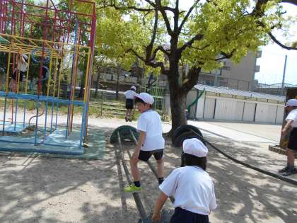 平均台のような,鉄の棒はバランスよく渡りきるのが難しいです。くり返し挑戦していました。上り棒をすいすい登りきる子や,うんていを最後まで足をつかず進む子もいてどの遊具も上手に使って,体を動かしていました。