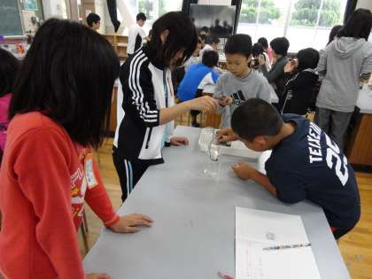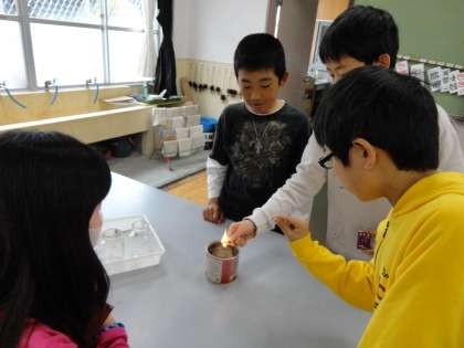 かんやびんの中で,燃える様子や空気の動きを調べたり,びんの口の広さを変化させて炎の様子も調べました。