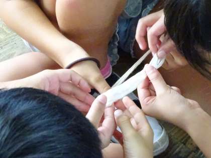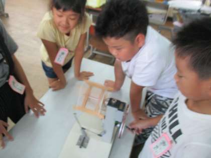 今日は,京都工芸繊維大学からお借りした蚕の繭と糸繰り器を使って,糸繰り体験をしました。蚕の繭からとれる糸の長さはなんと1300m!器械を回す回数は3000回にもなります。糸の強さは,初めと終わりの部分が弱いので,子どもたちは慎重に回していきます。調子が出てきたらスピードを一定に保って,グルグルと回していきます。出来上がった糸の束を手に取り,「めちゃくちゃきれい」「フワフワやけど丈夫」など感動した様子でした。貴重な体験でした。