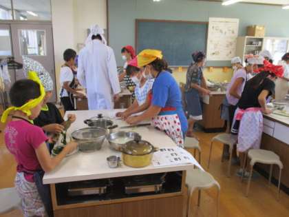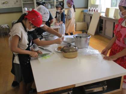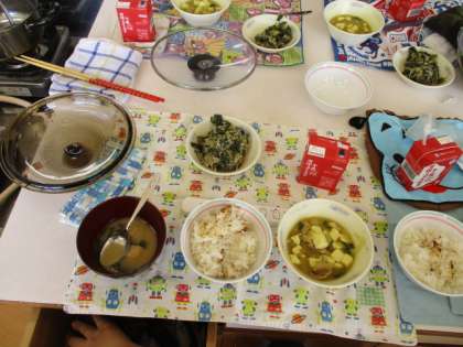 各班で,みそ汁の具材を考えて,「みそ汁」と「ご飯」を作りました。「みそ汁」の具材の人気は,大根・ワカメ・油あげでした。「みそ汁の味だいじょうぶかなぁ?」と心配していた子どもたちでしたが,「めっちゃおいしい!」と言って大満足でした。「ご飯」は,「おこげできた!」「ちょっとかたそう!」と言いながらも,にこにこしながら食べていました。