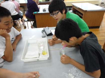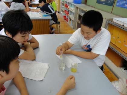 理科では「ご飯は口の中でどのように変化するか」の学習をしました。ご飯つぶをつぶしてあたためながら一方に水,もう一方はだ液を加えてしばらく置き,口の中と同じような環境にしました。そして5年生のときに使った,でんぷんに反応するヨウ素液を用いて,ご飯にふくまれるでんぷんの変化を調べました。