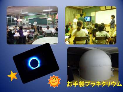 南太秦おやじの会主催,PTA共催で,昨年に引き続き「天体観測会」が催されました。あいにくの天候で,用意されていた天体望遠鏡を使って土星などの観測はできませんでしたが,たくさんのイベントが準備されていました。日食のDVDコーナー,天体にまつわるクイズコーナー,月についてのお話コーナー,そして,手作りのプラネタリウムです。どのコーナーもよく工夫され,参加していた児童や保護者のみなさんはたいへん喜んで帰られました。圧巻は,プラネタリウム。お手伝いいただいていた立命館大学天文研究会の学生さんが持ってきて組み立ててくださいました。中に入ると,ロマンチックな星空が広がっていました。開催していただいたおやじの会,PTA役員さん,そして,立命館大学天文研究会のみなさん,ありがとうございました。