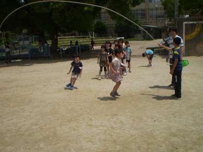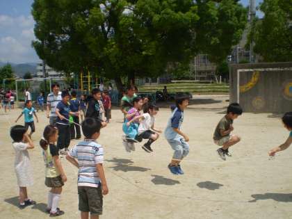 中間休みに,たてわりのグループで大縄跳びをしました。一人ずつ順番に跳んだり,グループ全員で跳んだり,グループによって跳び方はさまざまでしたが,どのグループも楽しそうに遊んでいました。