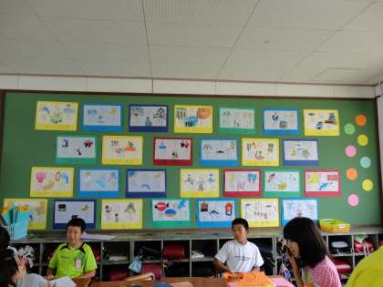 図画工作で取り組んできた「修学旅行の思い出」が完成し,教室の後ろにお助け係が掲示してくれました。雰囲気が変わって,気分新たにがんばれそうです。