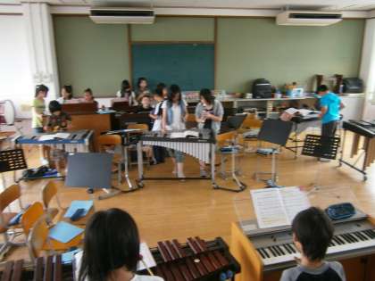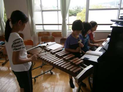 和音・低音・主せん律のパートに分かれ,演奏します。合奏は楽しそうに練習しています。