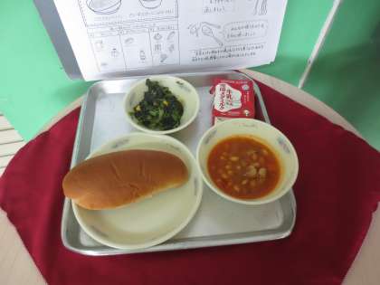 「大豆と鶏肉のトマト煮」は、じっくりと煮込んでいるので、大豆や鶏肉や野菜にトマトの味がよく染み込んでいました。