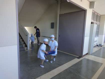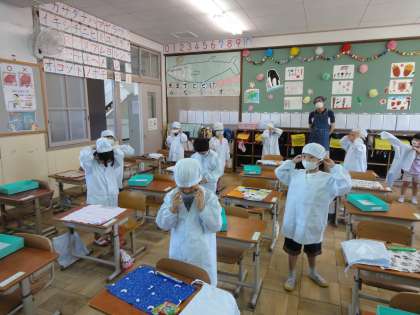 きゅうしょくとうばんの えぷろんの きかたや かたづけかた…