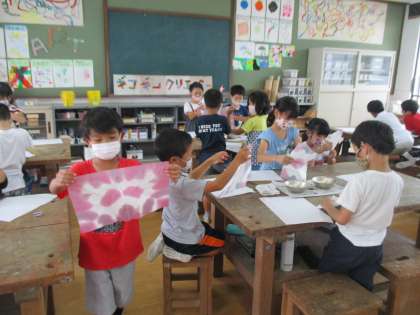 和紙染めを楽しみました。和紙の折り方もそれぞれ個性が表れていて,