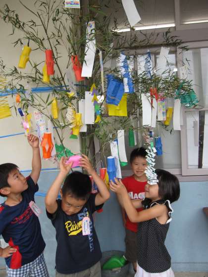 みんなで短冊に願い事を書き,ちょうちんや天の川などの笹飾りを作りました。