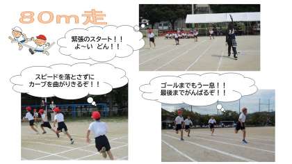 「80m走」では,勢いよくスタートし,カーブを上手に曲がって,ゴールまで力いっぱいかけぬけることができました。