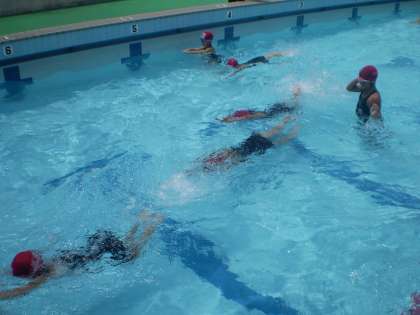 2年生は,バタ足の練習に一生懸命に取り組んでいます。壁につかまってまっすぐに足を動かす練習やビート板を使って練習をしてきました。今日は2年生になって,初めて25メートルのコースを泳ぎました。1年生のときよりもたくさん泳げるようになった子が増えていました。